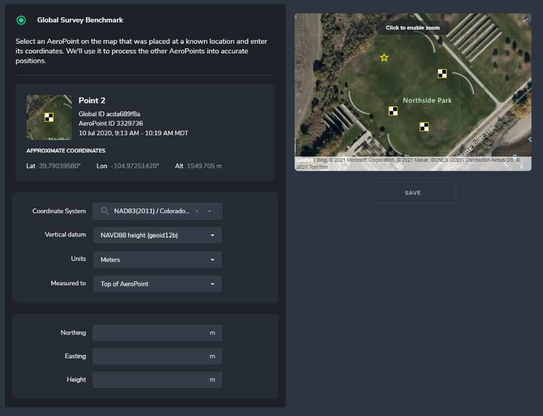 You will select an AeroPoint with a known location and enter its coordinates here. If you used the known point benchmark method to process your AeroPoint survey, be sure it is selected as a Ground control point unless it is outside the survey area.
