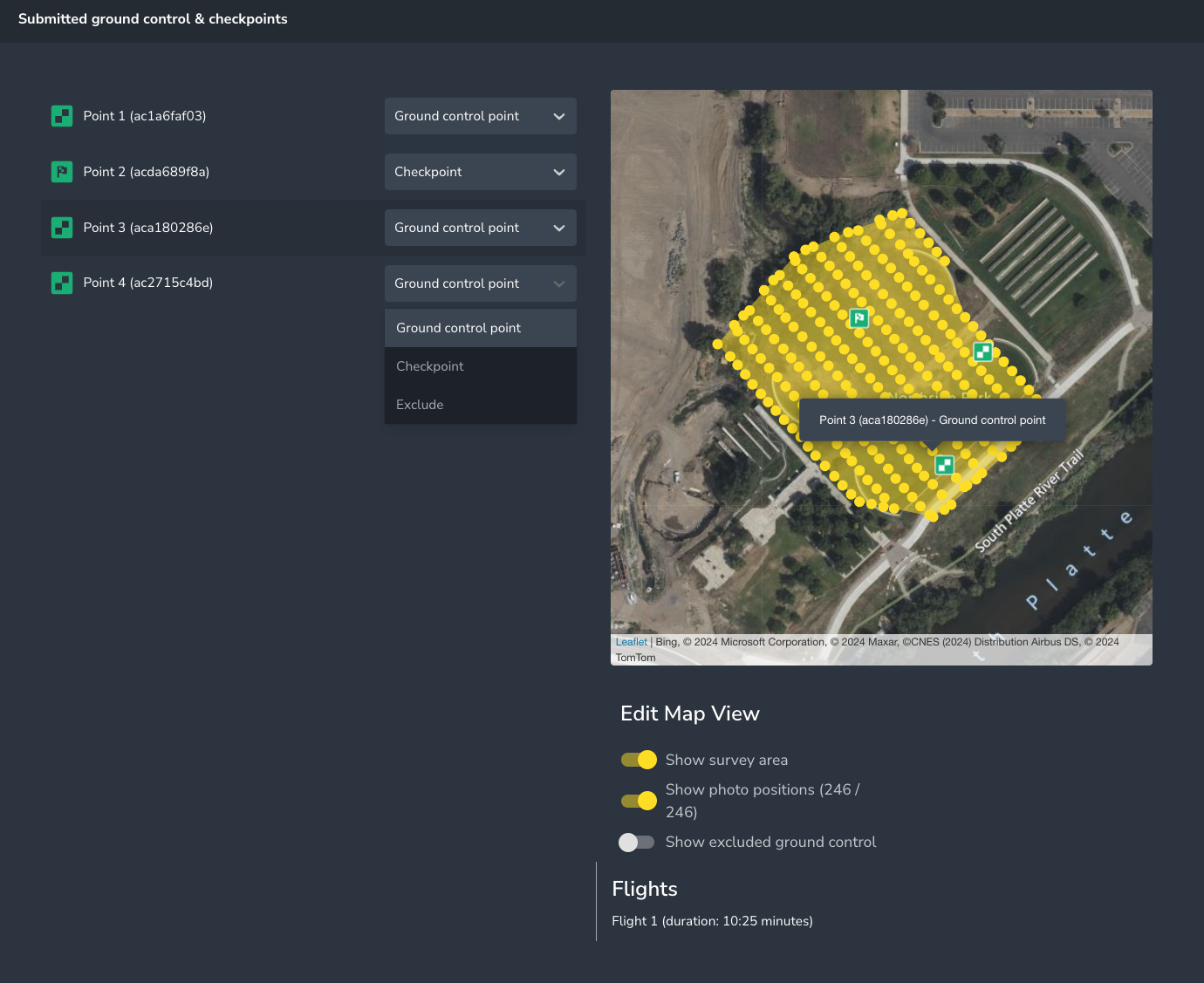From the dropdown, assign each AeroPoint in your survey as a Ground control point or checkpoint. You can also exclude it from your survey.