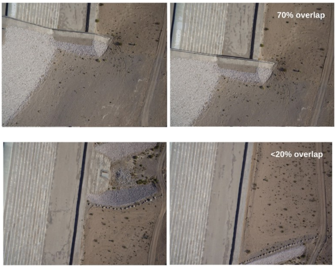 The basic principle of photogrammetry requires matching features between photos to form a single contiguous model. The images must overlap a lot for features to be matched. The biggest culprit we see that makes aerial photos unusable is the lack of overlap, and it’s often the easiest issue to fix.